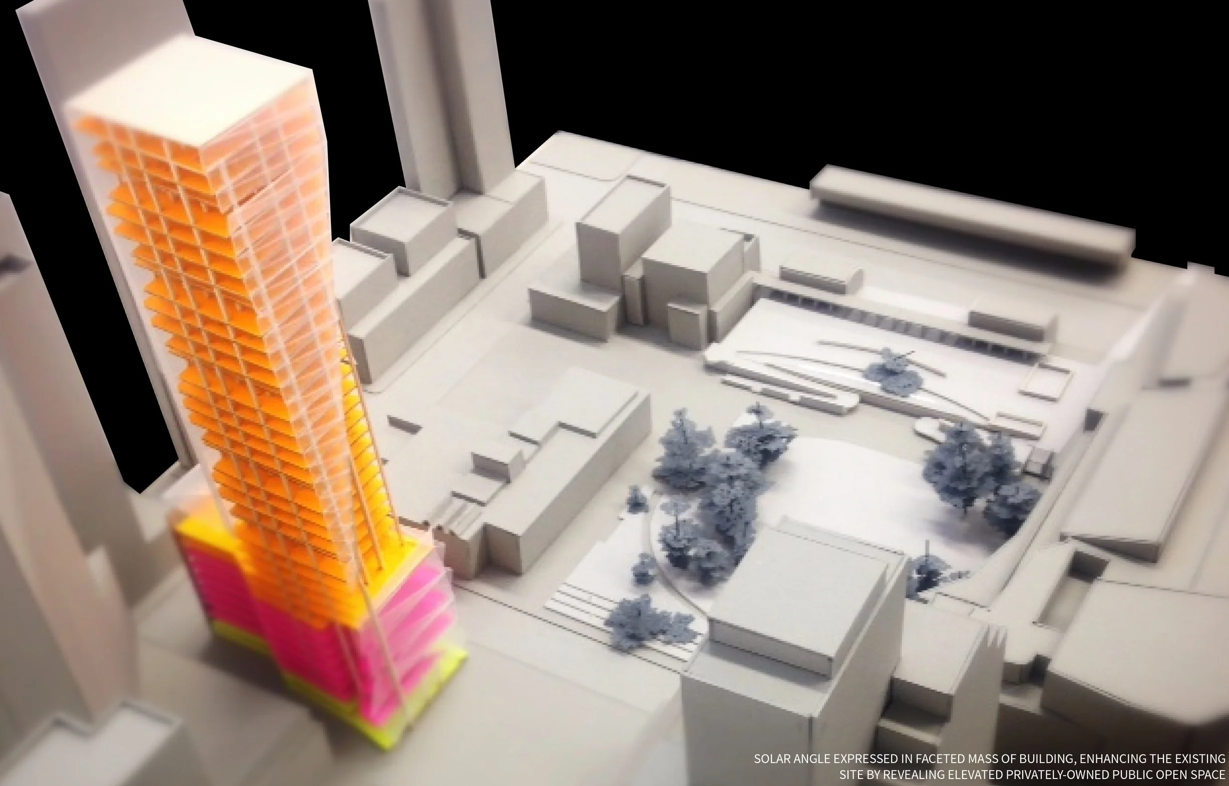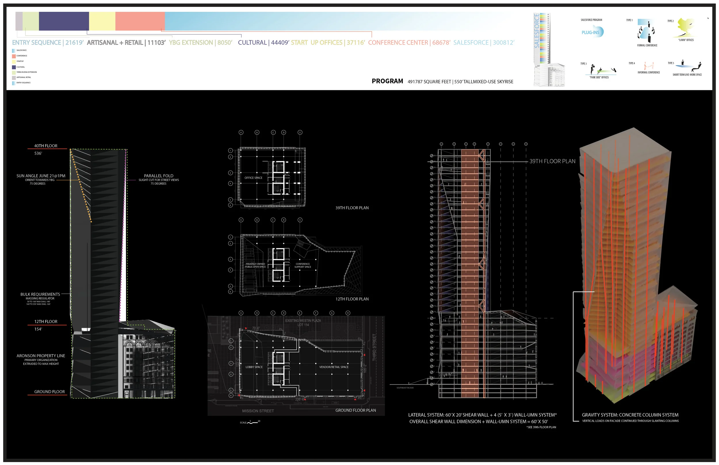 The semester long fourth year design studio required a response to an already vibrant South of Market urban site adjacent to Moscone Center, with the additional complexity of responding to an existing 10-story historic building adjacent to Jessie Plaza, an architecturally significant Jewish Contemporary Museum, and the privately-owned Yerba Buena Gardens Park across an active Mission Street. Envisioned as a corporate headquarters for Salesforce in a location characterized by its highly active, open-space-rich context, and in a regularly sunny climate, Vibrant Tower is a mixed-use tower with Salesforce’s corporate offices expanding into the cloud up to 536’, segmented in form by the building limits of the historic Aronson building, and faceted by the angle of the sun at 1pm on the summer solstice. From artisanal retail on the ground floor, to museum space, start-up office space, conference support space, and to corporate offices above, the building is a hub for cultural and entrepreneurial activity from the scale of the pop-up entrepreneur to the scale of the global technology presence that is Salesforce.