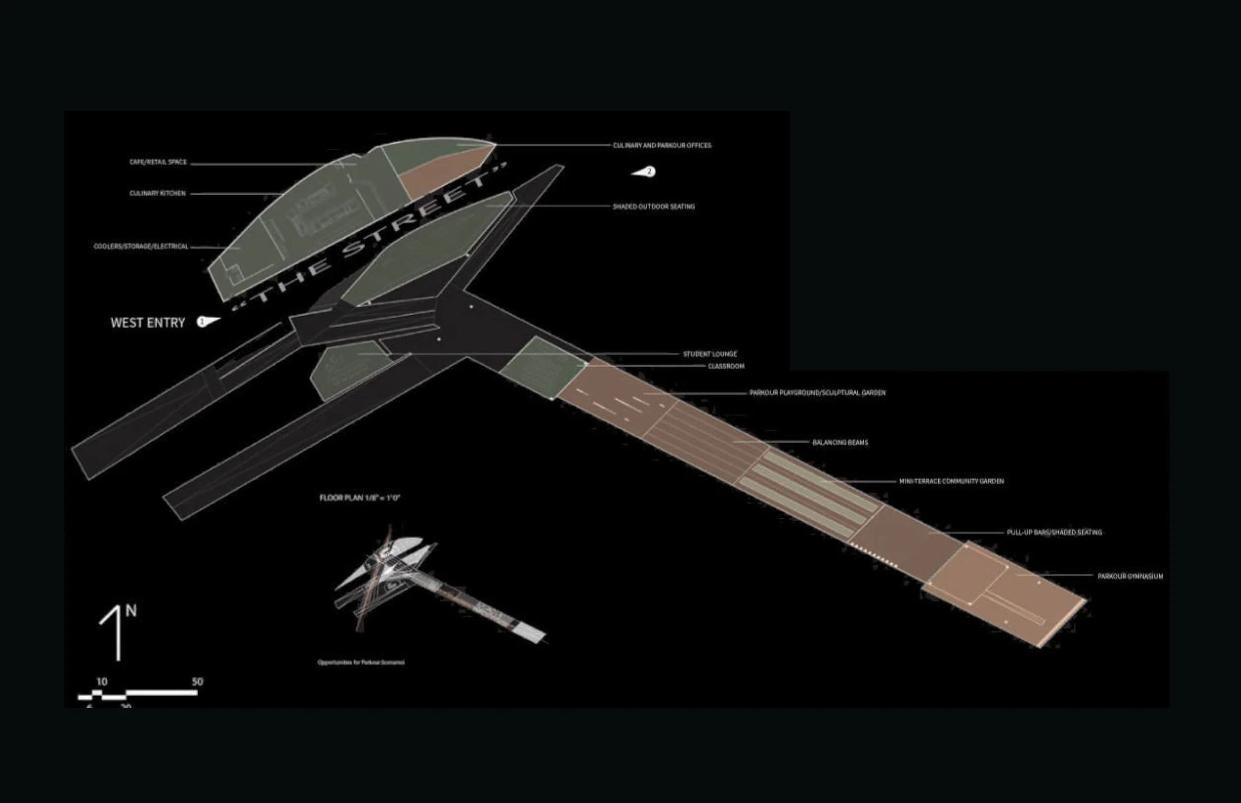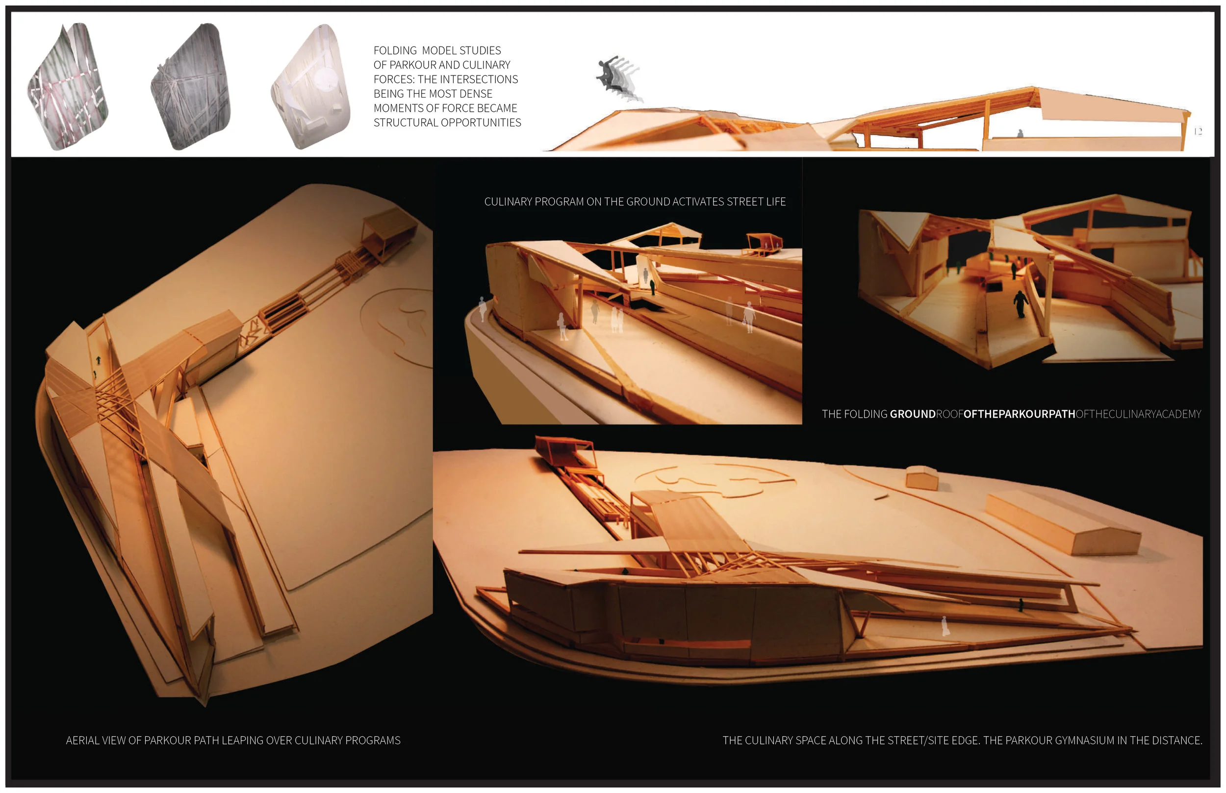 The semester long second year design studio required the design for the assigned hybrid program of a Parkour and Culinary Academy. The activity of parkourists redefine the urban environment as a narrative of formal obstacles for the parkourists as they take direct paths through the city. The addition of a culinary academy promotes health in the community through the cultivation of an intimate relationship between the people and their food. As the Lake Merritt Park site is adjacent to a weekly farmer's market, and exercise paths that travel around Lake Merritt, the folding parkour and culinary academy is a place that promotes the health and fitness of the Oakland community with spaces to cook, sell, dine, climb, drop, sprint, and flip.